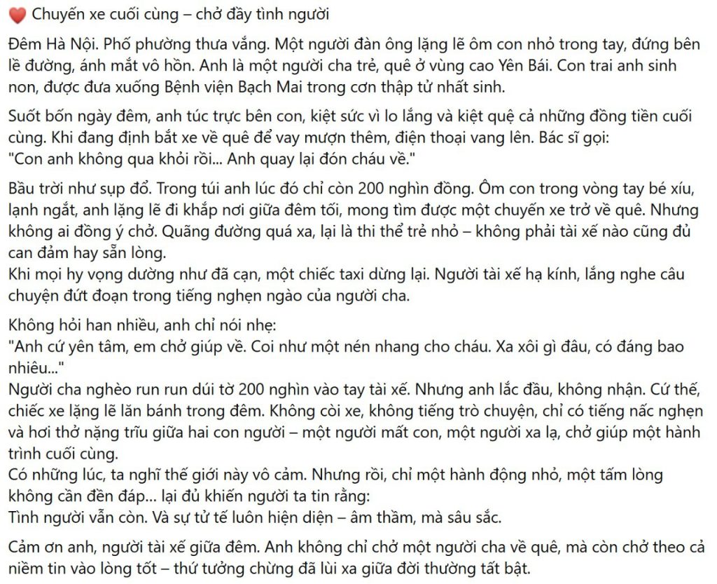 Xót xa, trước cảnh người cha không còn đủ tjền để thuê xe đưa con vừa m:ất ở Hà Nội về quê Yên Bái và câu chuyện cảm động về bác tài chạy taxi “Anh cứ yên tâm, em chở giúp về. Xa xôi gì đâu, có đáng bao nhiêu.” Ấm lòng lắm bác tài ” cho đi là còn mãi ” ❤️