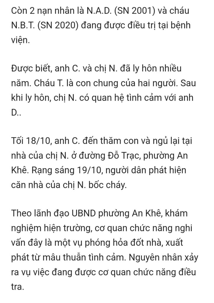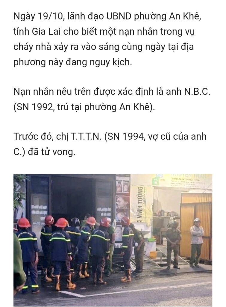 cháy tiệm spa ở phường An Khê,tỉnh Gia Lai khiến một người tử vong, 3 người bị thương, đến chiều nay có một nạn nhân đang nguỵ kịch.Cơ quan chức năng nghi vấn đây là vụ phóng hỏa.