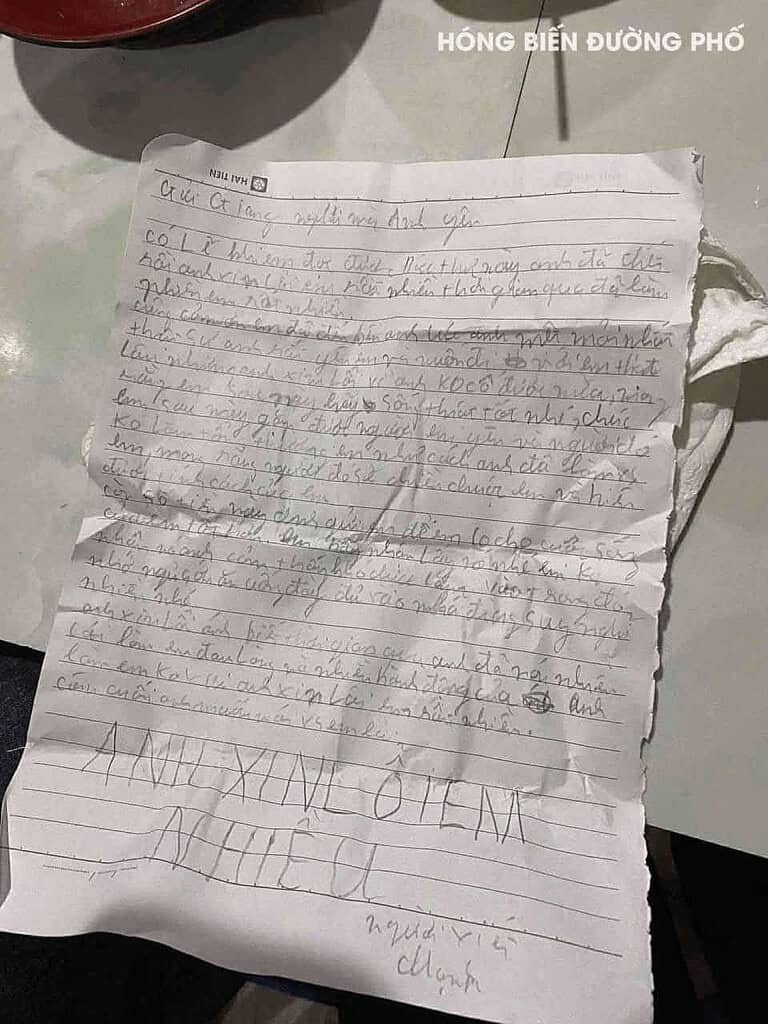 Gửi Giang người con gái anh yêu có lẽ khi em đọc được bức thư này anh đã chết rồi anh xin lỗi em rất nhiều thời gian qua làm phiền em rất nhiều cũng cảm ơn em đã đến bên anh lúc anh mệt mỏi nhất thực sự anh rất yêu em và muốn đi với em thật lâu nhưng anh xin lỗi vì anh không cố được nữa mong rằng em sau này hãy sống thật tốt nhé chúc em sau này gặp được người người mình yêu và người đó không làm tổn thương em như cách anh đã làm với em mong rằng người đó sẽ chiều chuộng em và hiểu được tính cách của em còn số tiền này anh gửi em để em lo cho cuộc sống của em tốt hơn em hãy nhận lấy nó nhé em không nhận anh cảm thấy khó chịu lắm và trong đó nhớ ngủ với ăn uống đầy đủ vào nhé đừng suy nghĩ nhiều nhé anh xin lỗi anh biết thời gian qua anh đã nói nhiều làm em đau lòng và nhiều hành động của anh làm em không vui anh xin lỗi rất nhiều câu cuối anh muốn nói với em là anh xin lỗi em nhiều. Cháu nó mới 2k9 :((