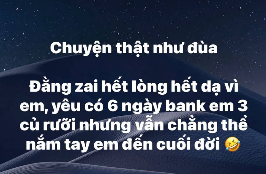 NHƯ ĐÙA: ĐẰNG ZAI HẾT LÒNG HẾT DẠ VÌ EM, YÊU CÓ 6 NGÀY BANK EM 3 CỦ RƯỠI NHƯNG VẪN CHẲNG THỂ NẮM TAY EM ĐẾN CUỐI ĐỜI 🤣