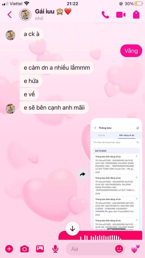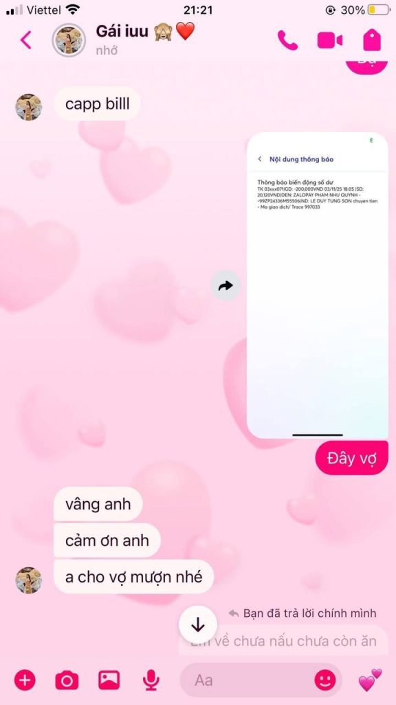 “Em thiếu tiền anh lo cho em vậy anh hỏi thứ anh nhận lại là gì? 1 sự lừa dối à? Trong khi ngày đi làm vật vã tối về chỉ mong được sự an ủi động viên từ em. Em bảo em đói a ck cho ăn, em bảo em sửa con 15 a cho 1tr6 lấy máy, em bảo e nợ ngta 1tr2 a cho 1tr2 để giả nợ cho ngta. Anh làm tất cả cũng chỉ muốn e về với anh mà cuối cùng a nhận lại là lời nói dối sự tổn thương từ e với anh…”